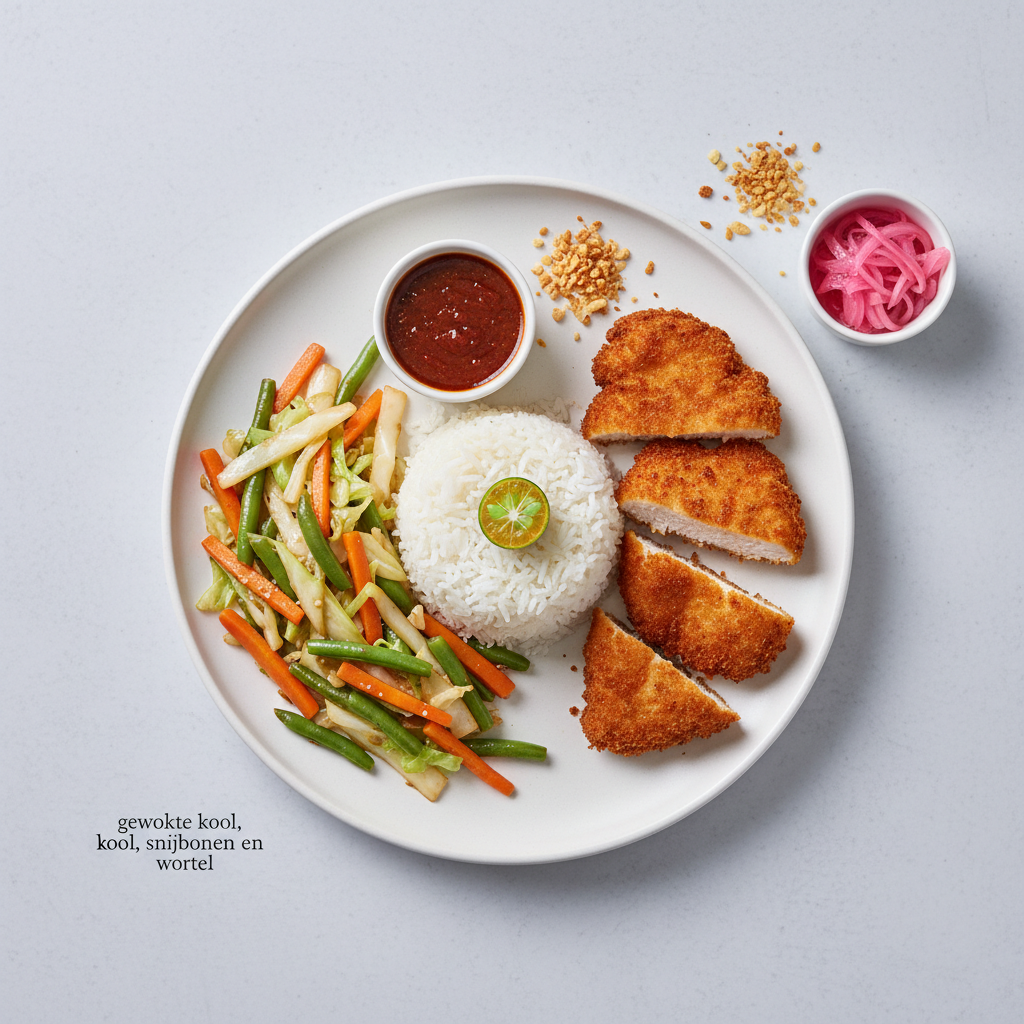 Filipino style buffet | rijst | gewokte kool, snijbonen en wortel | krokante kipschnitzel