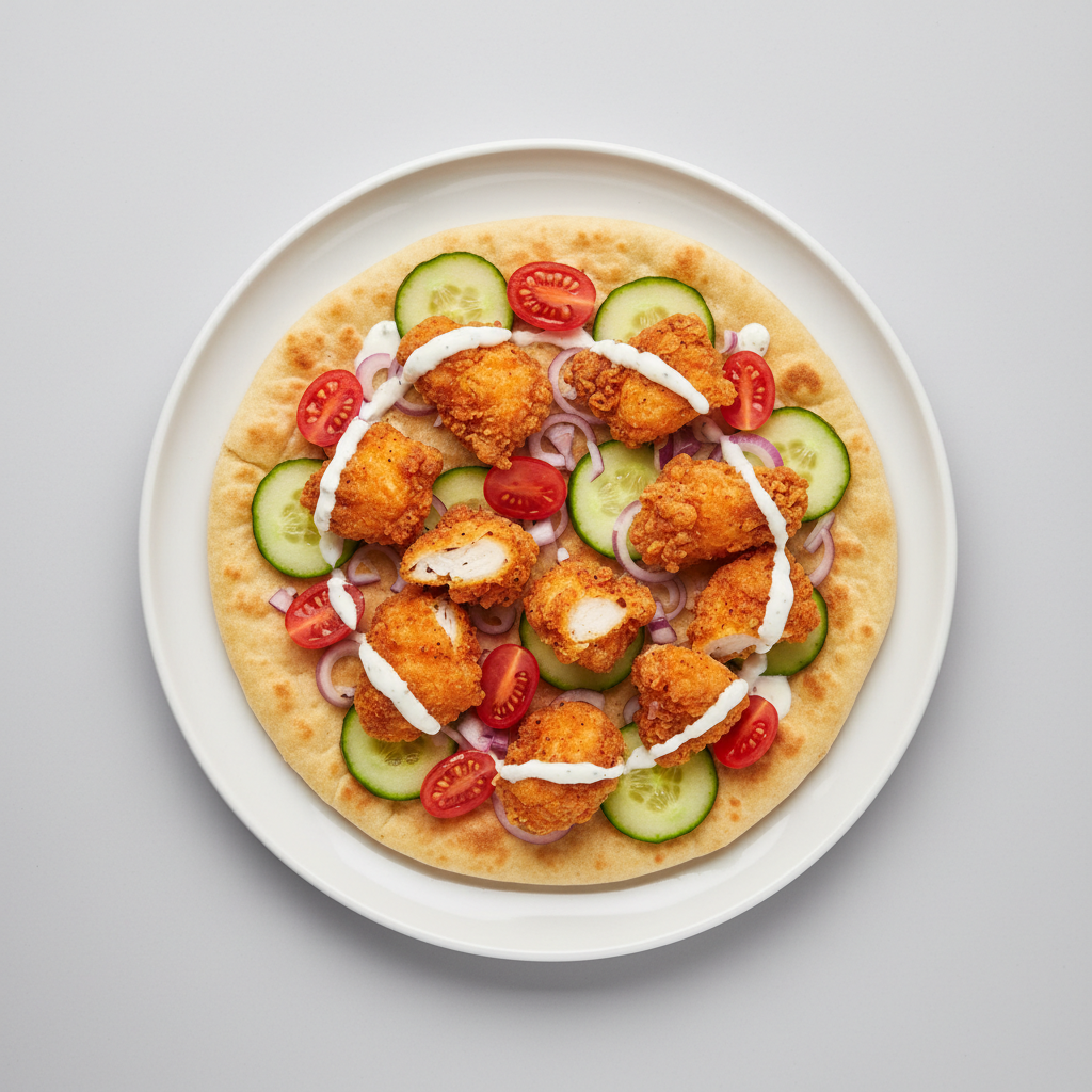 Flatbread | krokante kip | komkommer | tomaat | rode ui | knoflooksaus